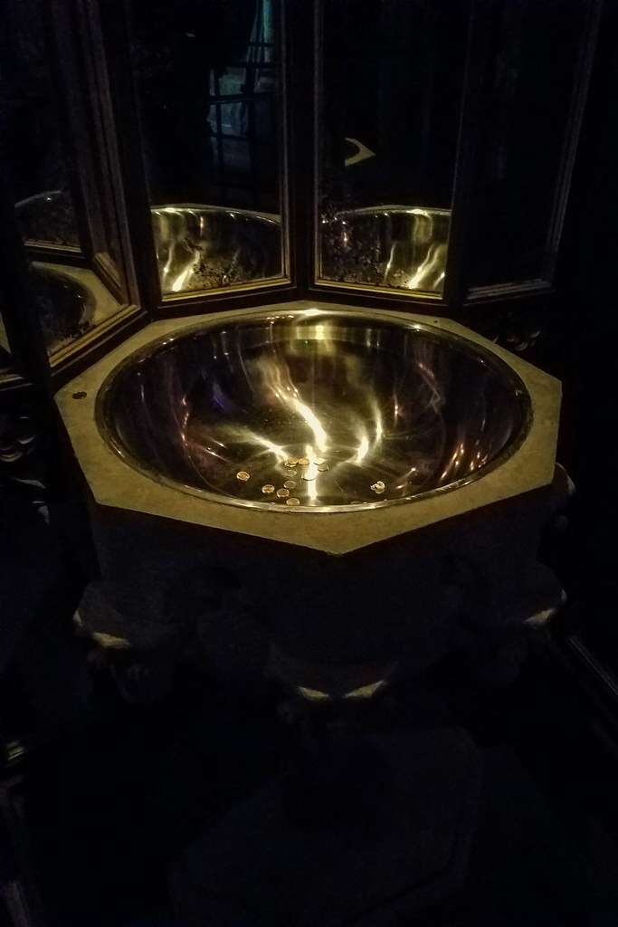 Si presenta come una vasca poco profonda, solitamente realizzata in un materiale prezioso come l’argento o l’oro, ed è riempita con una sostanza argentea che assomiglia a una nuvola vorticosa.